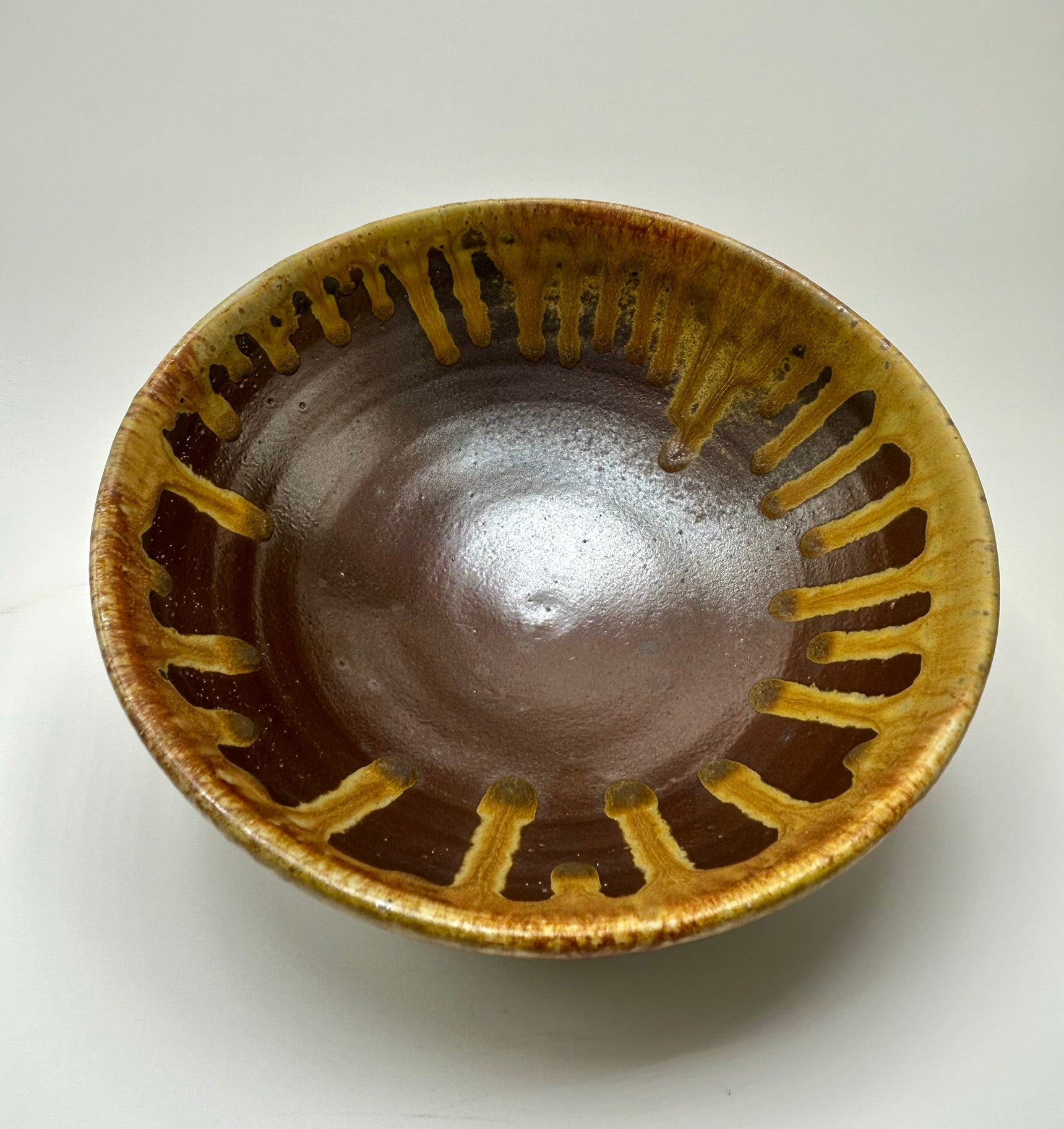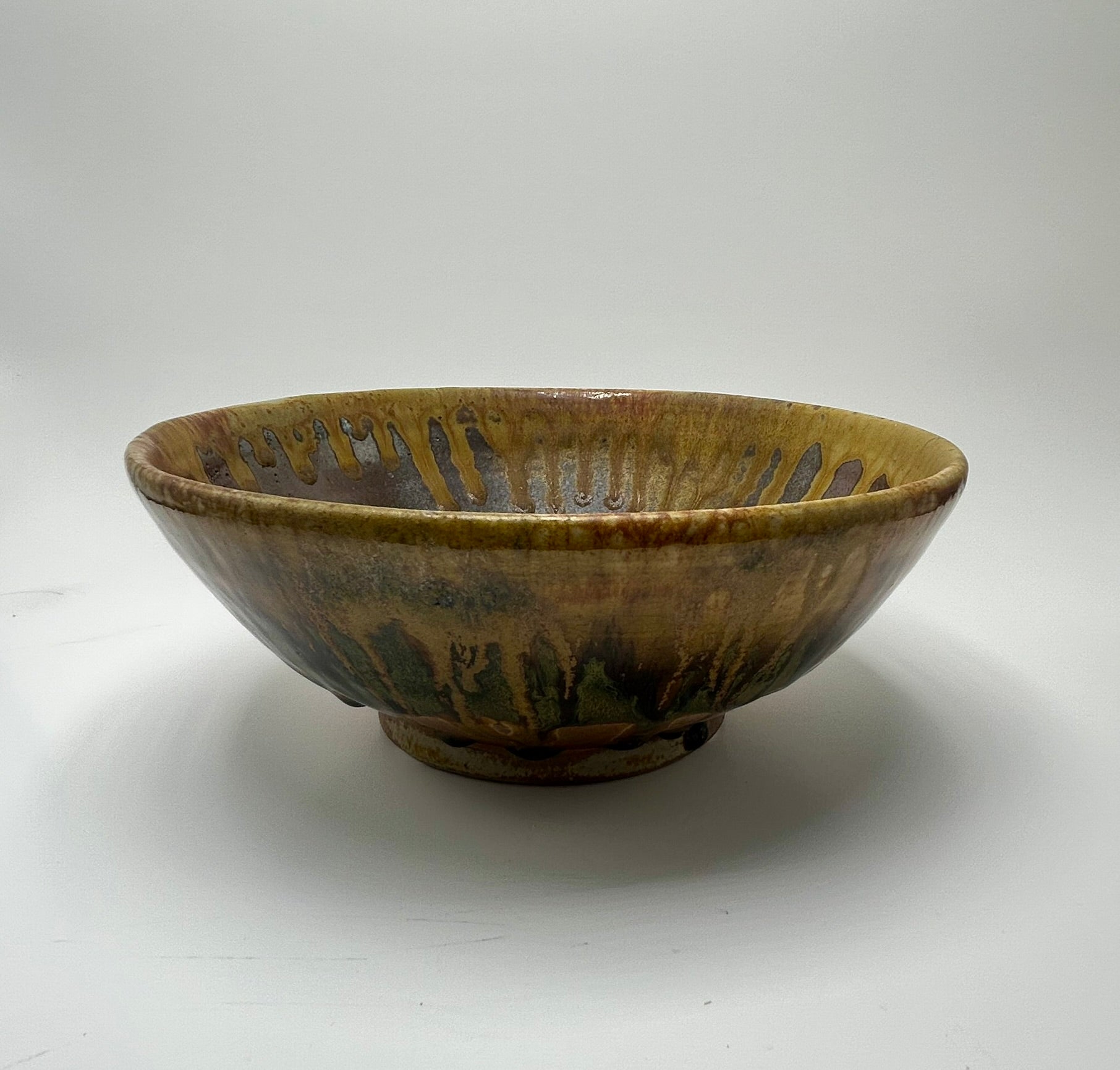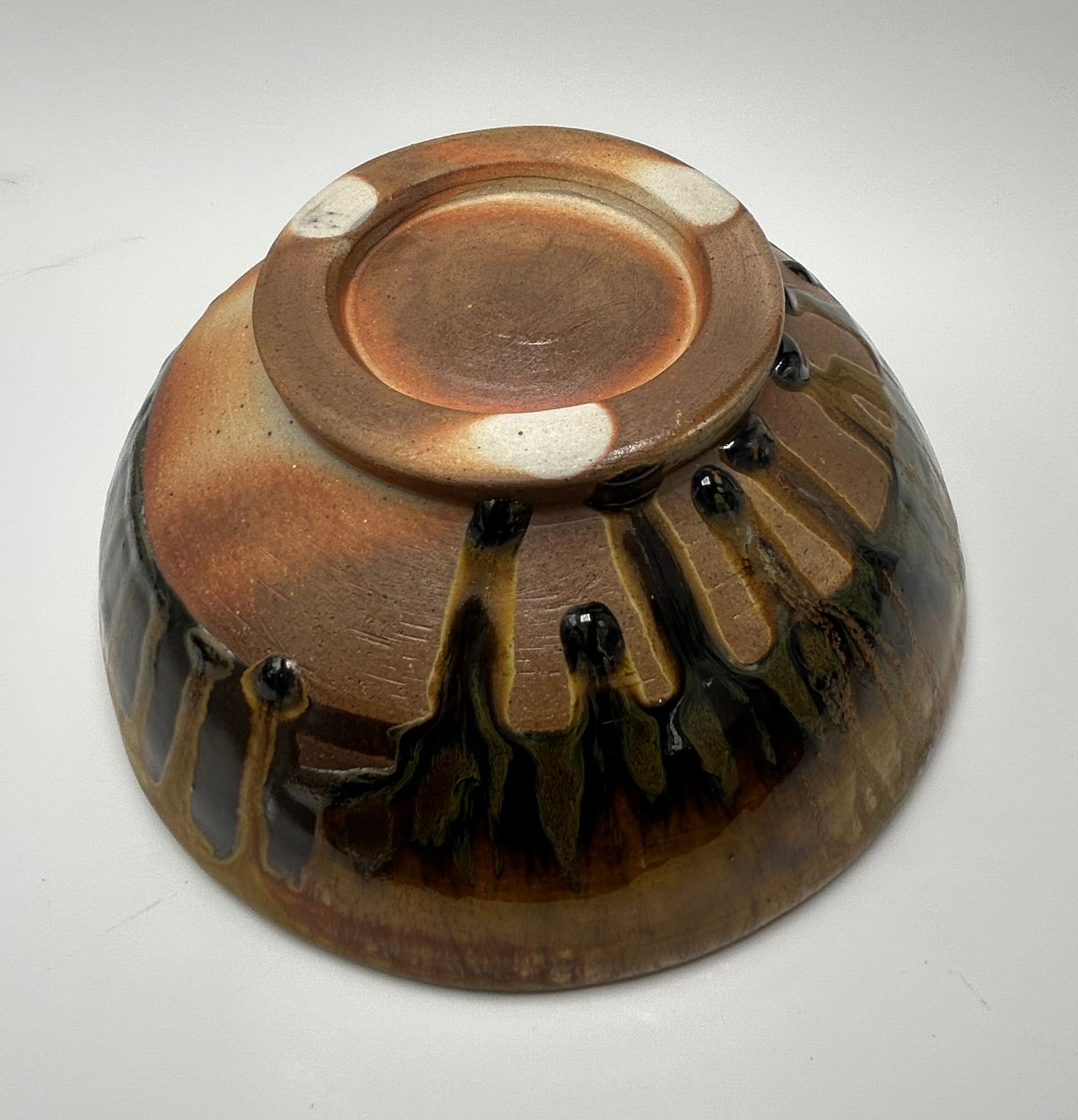 Medium sized serving bowl. Stoneware decorated with a matte shino glaze and ash glaze on the rim/exterior. Wood fired to cone 10 (~2350 F). Microwave and dishwasher safe. ~3.5" H X 8.5" W